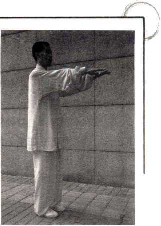 身体直立;同时,两掌掌心 朝下,分别向外沿面前外侧 划圆至胸前,两臂伸直平举、