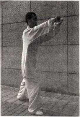 图1-7-3图1-7-4重心移到左脚,右脚脚 掌收到左脚里侧虚点地,再 向則迈出一■步,左脚跟一■步,