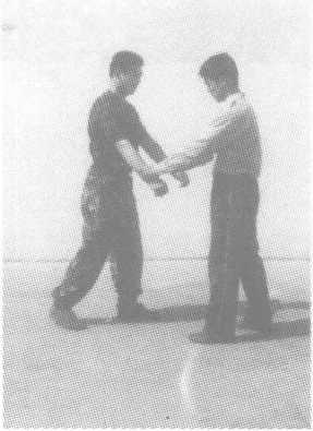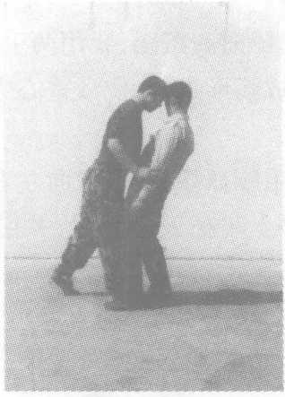 对方迎面将我双手腕抓住,我两臂向左右两侧挣脱,同时速起 右脚猛踢其裆部;顺势上步插入其胯下,并用头部猛撞敌面部,围 即解。