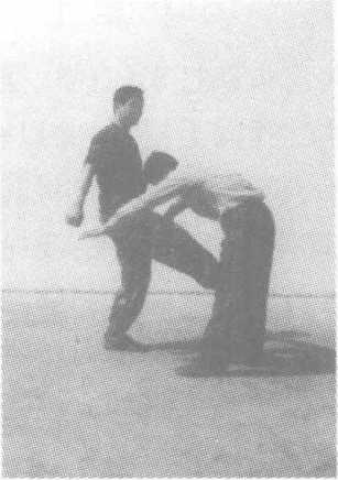 另:当歹徒由前起腿向我蹬踢,我用两手抓握其腿,随即向下、 向左上方(或右上方)成弧形上抬,使敌重心失控倒地。