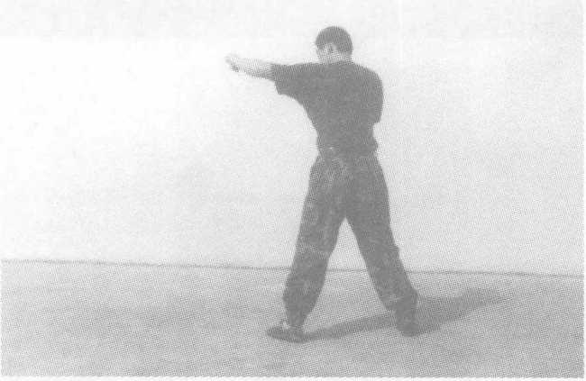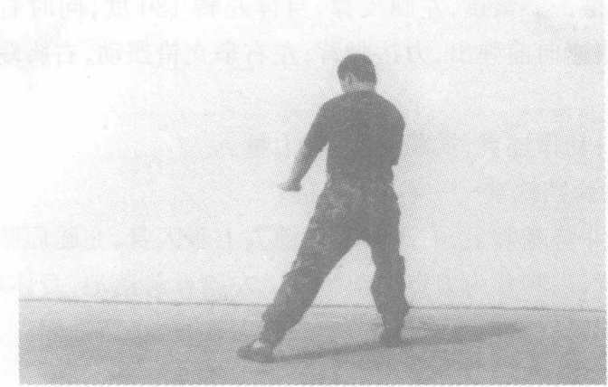 左脚向前落地,右脚微蹬地,上体向左转,同时右拳向外向前、 向里弧形摆击。紧接,左腿支撑,身体左转180度,同时右腿屈膝 抬起,并快速向前弹出,力达脚背;左右拳交错摆动,右脚踢出后收 回。