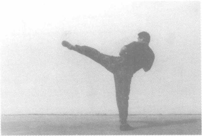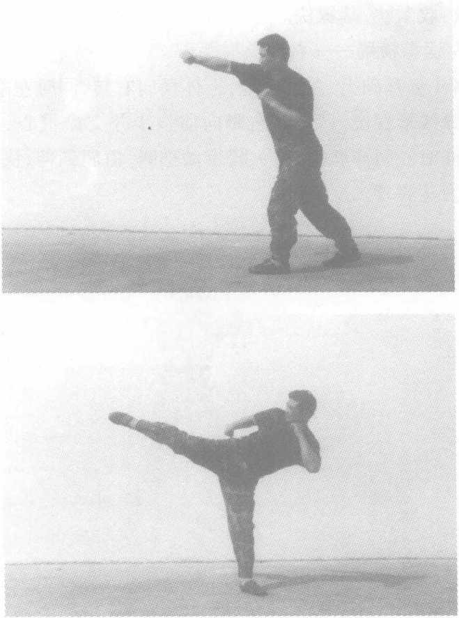 在格斗势基础上,左脚蹬地,上体稍向右转,同时左拳向外、向 前、向里弧线形摆击。紧接,右脚向前垫步并支撑重心,身体稍向 右侧倾洞时左腿屈膝抬起,大腿带动小腿,由屈至I」伸,快速向前挺 膝横踢,力达脚背。