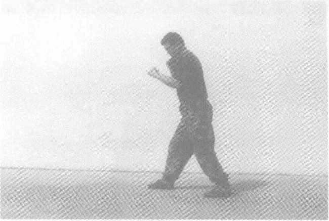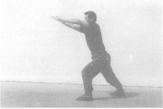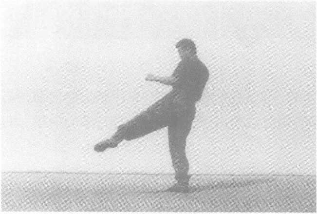 在格斗势基础上,右脚向右侧前方上步闪身,左腿屈膝向前提 起,绷脚背,以脚背为力点向前猛踢。左脚顺势落地,身体左转,重 心降低,同时双掌向左下劈击,掌心相向,力达小指外侧。