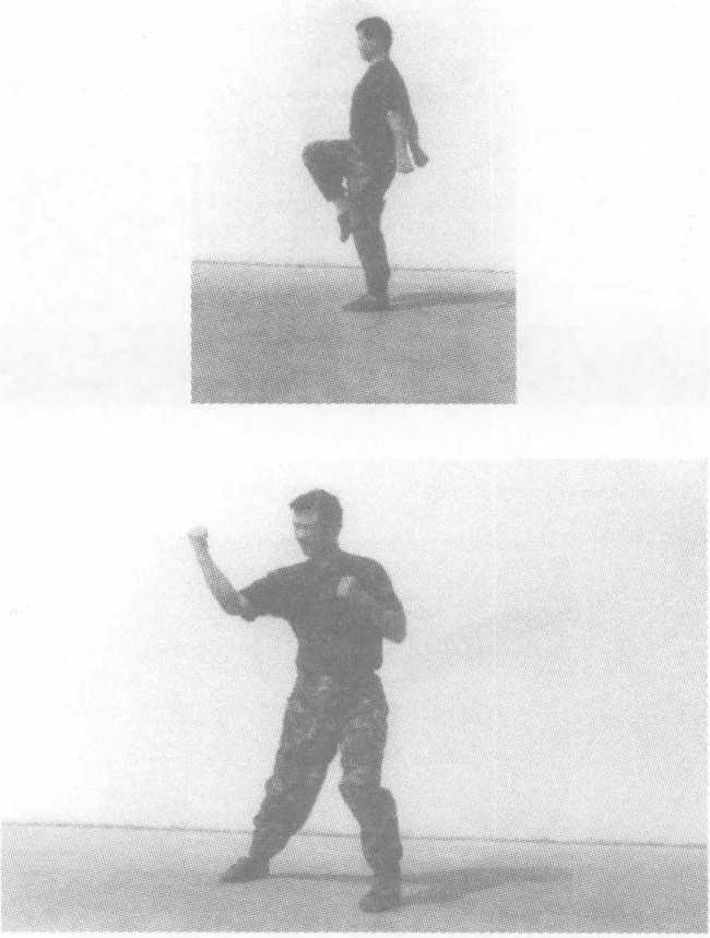 动作不停,身体右拧转,同时右腿屈膝抬起向前顶击。右脚落 地,上体左转同时右拳由下向前上方勾击,拳心向里,力达拳面,目 视右拳。