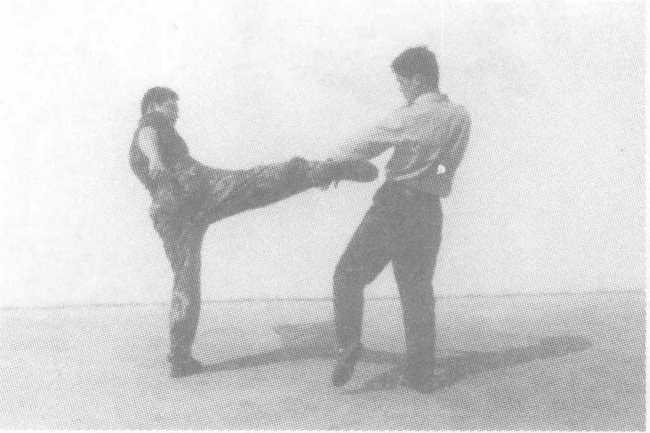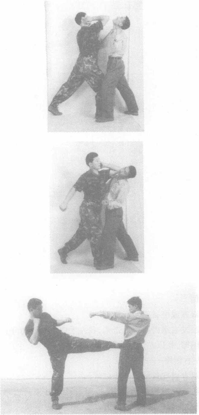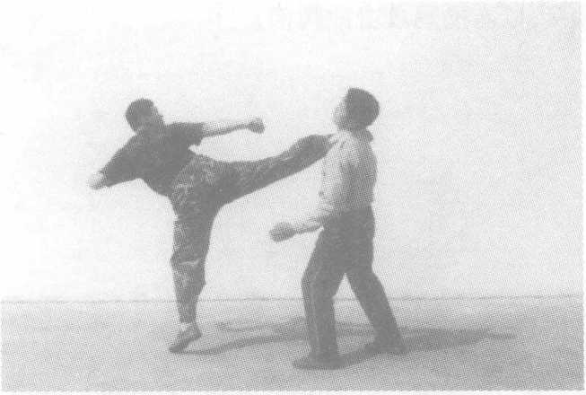 (1)双方成准备格斗姿势;(2)我以左横踢攻敌下盘,吸引其注意。或敌以拳攻击我上盘,我身体后仰,同时以左横踢反击敌中盘;(3)紧接,以右横踢攻击敌腰部;(4)我右脚前落,起左膝侧撞敌胸腹。(5)接上动,敌后退欲逃,我以右后摆踢猛击敌头颈部。