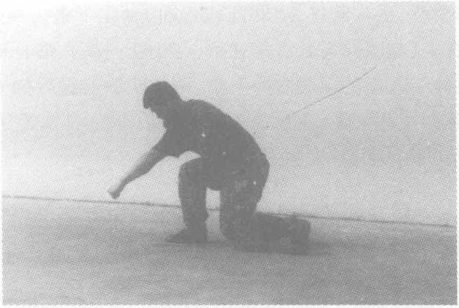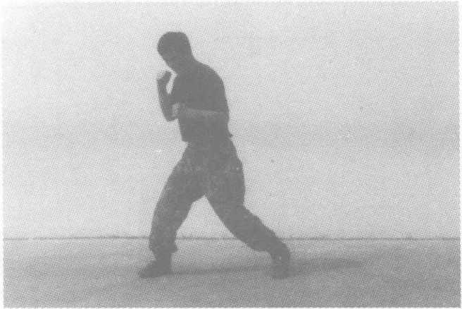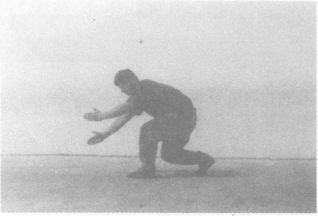 动作要领:滑步前进,随即两腿弯曲,身体下潜,,两手变掌下 插,左手在上(与膝同高),右手在下(与小腿同高),掌心相对;身体 向右后转体270度的同时右脚上步,两掌变拳上提后拉于胸前,上 体前俯,随即左膝下跪,左拳下击,与左膝同高,右拳置于下颌,目 视前方。要求:上步抱腿快,转摔猛。