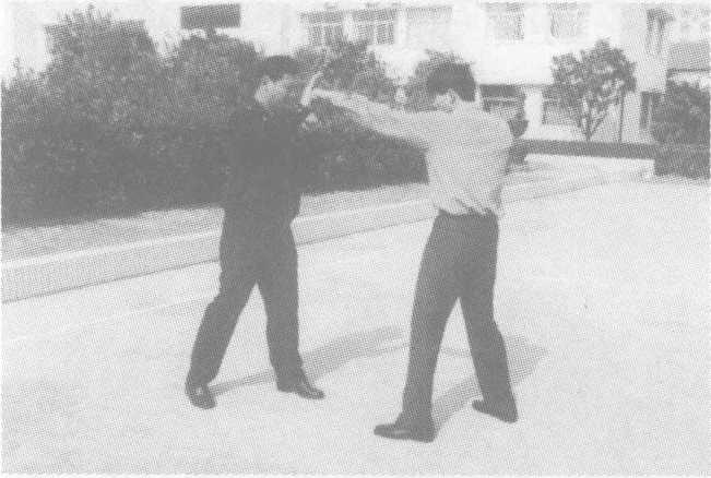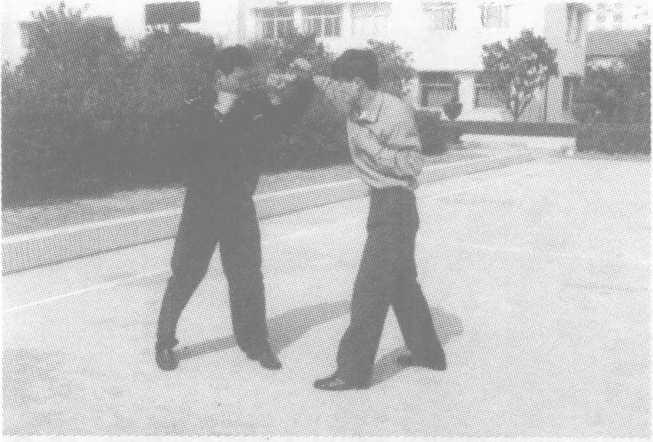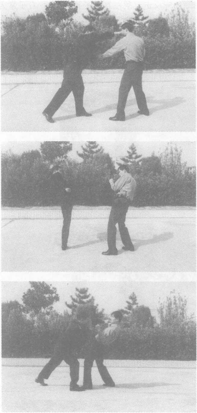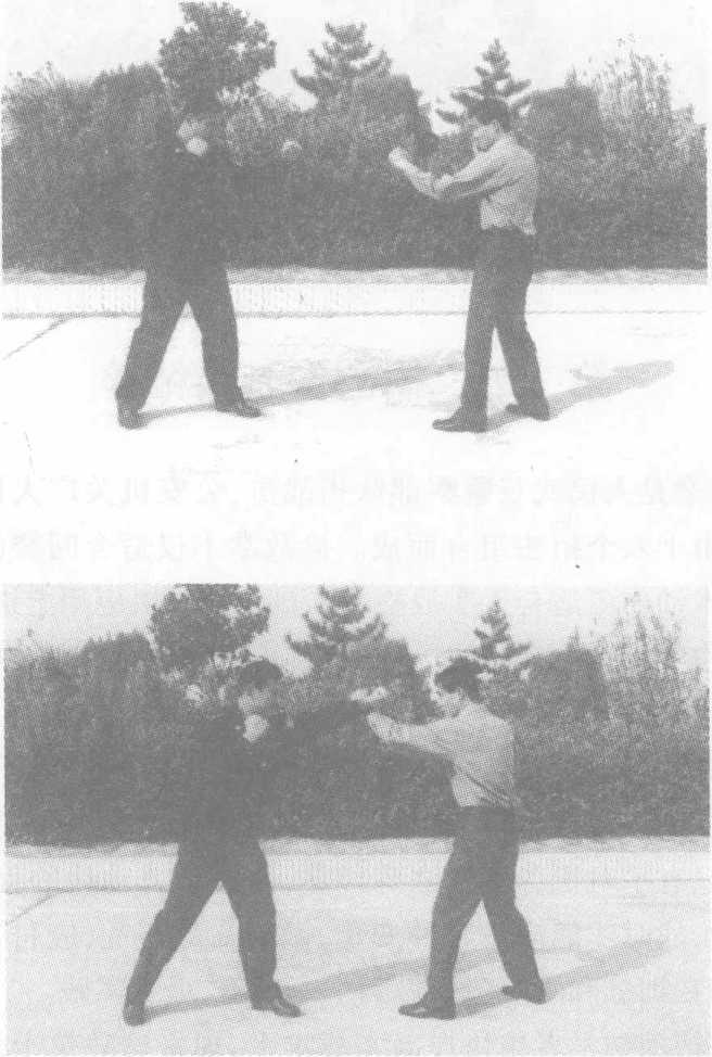 实用技法方法一:主动进攻。格斗势开始,我滑步以左直拳佯攻敌上 盘,引敌格挡防守;我左手搂抓压带对方防守手臂,以右直拳重击 敌头部;乘上势我以右腿横踢敌肋部,左直拳猛击敌上盘。方法二:防守反击。敌左直拳击我头部,我右手掌阻挡;敌用 右摆拳击来,我左臂格挡防守;我以左、右直拳击打敌上盘,紧接起 右膝撞击敌心窝。实战要求:阻挡时手掌位于自己脸部约一拳之距用力,阻挡与 拳打同时进行。视距离远近,可变右横踢为侧顶膝对敌实施攻击。