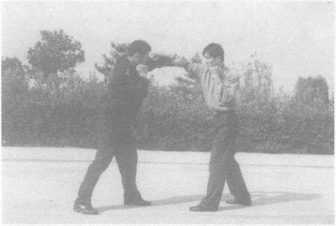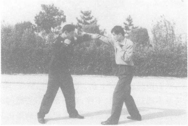 方法二:当敌用右摆拳(直拳)击打我头部时,我闪身的同时左