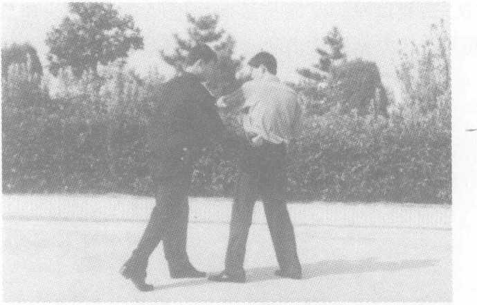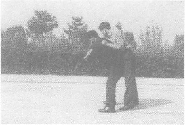 方法一:敌以右摆拳(直拳)击打我头部,我闪身的同时左手挡 抓敌右小臂;右臂从下向上挟抱其右大臂,同时右脚向左前上步, 左脚背步,紧接两腿蹬直,身体猛力向左下弯腰转体,同时臀部上 顶,两手向左下猛拉敌右臂,将敌摔倒。