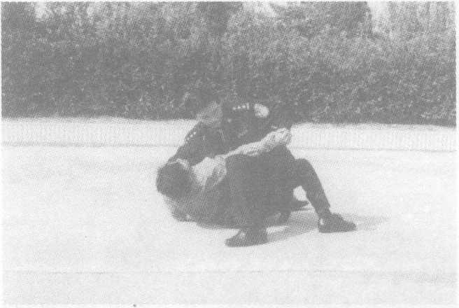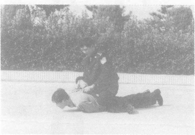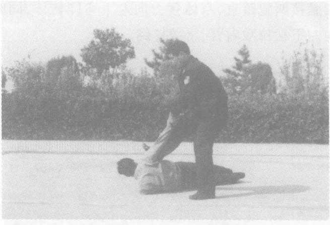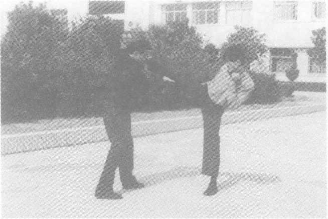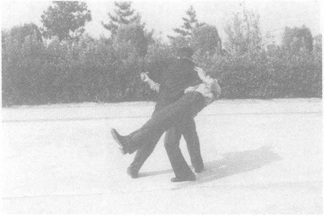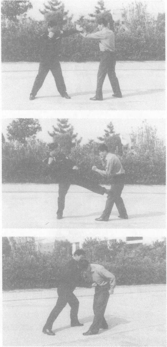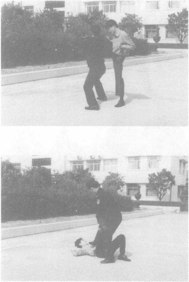 方法三:敌右横踢攻击我上盘,我阻挡抄抱防守,随即左转身 两腿屈膝,将敌右腿扛于右肩,不停,双手紧抱敌右腿脚踝下拉,配 以蹬腿,向前俯身合力,将敌向前摔倒,紧接起右脚蹬击敌胸腹部, 将敌制服。