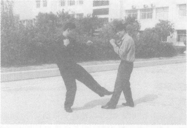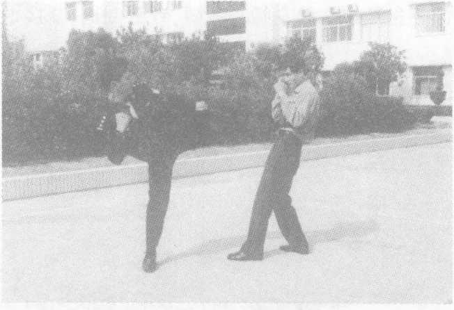 方法二:我以左脚掌踢击敌前小腿胫骨,接着快速旋靓,体向 右侧倾斜,改用左侧踹重击敌心窝;左脚落地同时以右拳勾击敌腰 部。