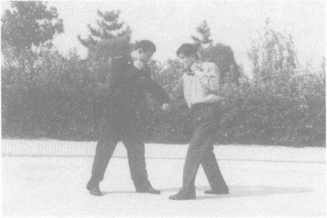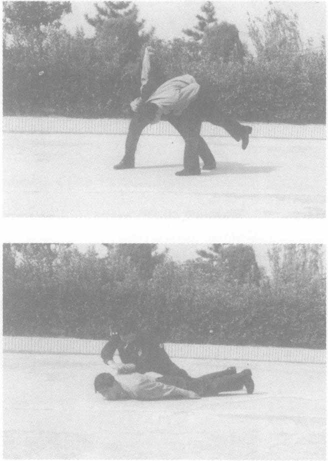 实用技法敌以右拳勾击我腹部,我左手臂向下格挡防守,同时用右勾拳 猛击其腹部,乘敌收腹弯腰之际,左小臂从其右臂内侧穿过,身体 向右后转体的同时,左肘上翻,左手扒住其大臂下压,右手由上扳 住敌右肘向怀里猛拉。起左腿绊敌腿,致敌倒地,紧接别臂折腕将 敌制服。