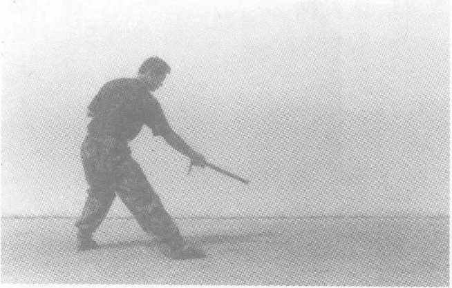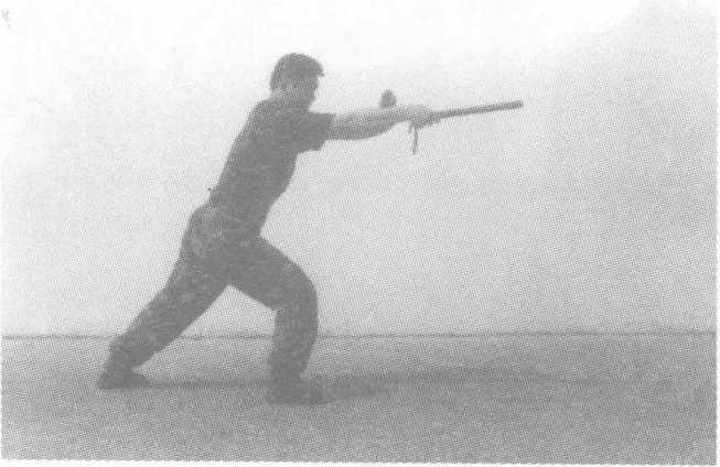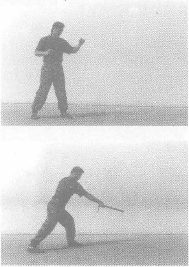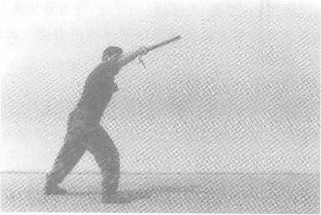 动作要领:格斗势开始,左脚向左前方上步,同时右手持警棍由右向左横 向扫击;右脚向前上步,身体重心前移,右手握警棍由下向前上方 点击,力达棍前端。接上动,身体重心降低,双腿屈膝,同时右手持警棍由左向右 低横扫击。右脚稍向前移,身体重心前移,右手持警棍向前捅出, 左手成掌位于右肩前。要求:动作连贯,扫棍突然,捅击快速、准确、有力量。此动作 主要用于攻击敌膝关节、面部、喉部、心脏,也可用于防守反击。