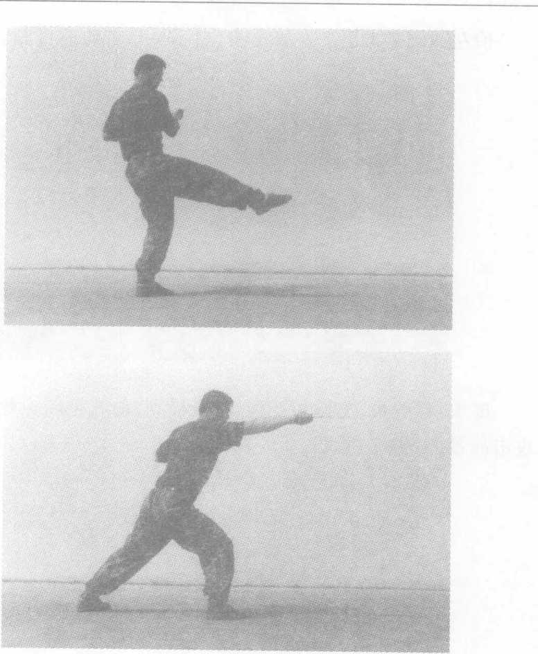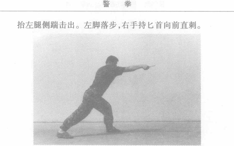动作要领:格斗势开始,右手反握匕首向左横割。起右脚向前弹踢,右臂自然左摆,支撑膝关节略屈;右脚前落, 右手持匕首向右水平横划。要求:起腿快,支撑腿要稳,落步横划、前扎果断。此动作用于 攻击敌颈部、胸部、肋部。第五章防暴突袭与反突袭