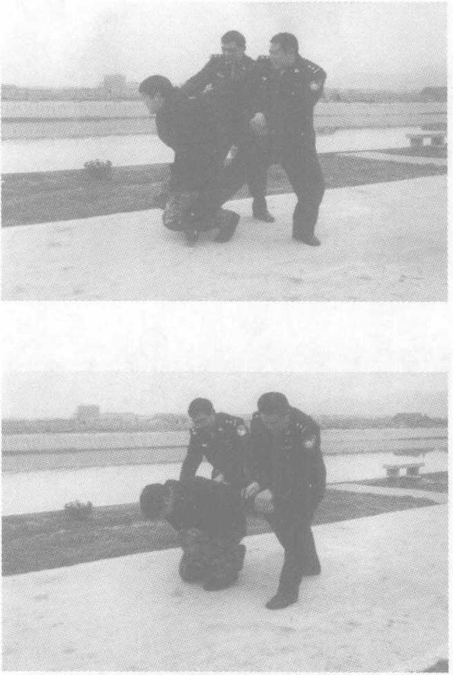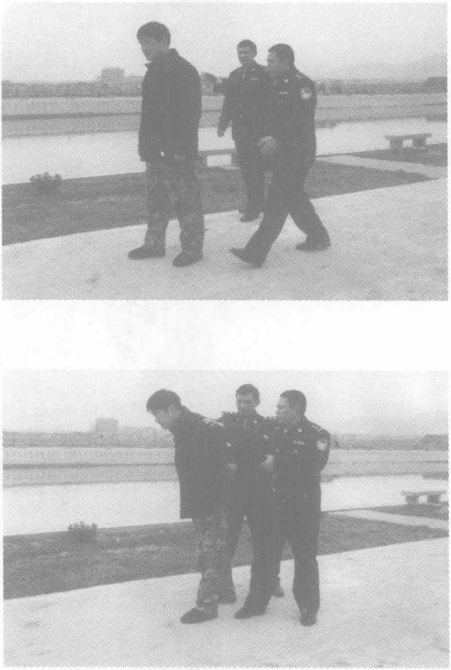 (一)小组由后突袭警察从犯罪嫌疑人身后隐蔽接近,两人同时抓握对方手臂后 拉,若其反抗,警察可同时踹击膝窝,使之下跪,一名警察别臂折 腕,另一名警察上铐控制。(二)小组由前突袭警察隐蔽意图,迎面向犯罪嫌疑人走去,一名警察击腹别臂的 同时,另一名警察抓住犯罪嫌疑人手臂,别臂卷腕,上铐将犯罪嫌 疑人控制。