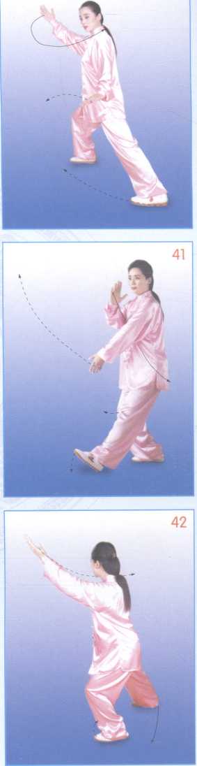 3 .两臂交叉重心在右腿,左脚 向前出一步,脚跟着地,成左虚步(隅 步),同时,右掌向左划弧至左耳侧,掌 心向左,指尖斜向上,左掌向右划弧 至右膝前,掌心向右,指尖斜向下,意 在右掌,目视左前方。(图41)