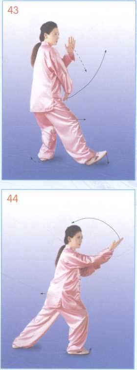 4 .左肩打靠重心前移,左腿前 弓,成左弓步(隅步),同时,左掌向前, 向右向上斜掬,至45度角(西南)方 向,掌心斜向里,指尖斜向上,右掌向 下向右捋至右膝上方,掌心向下,指 尖向前,意在左肩,目视右前方。(图 42)