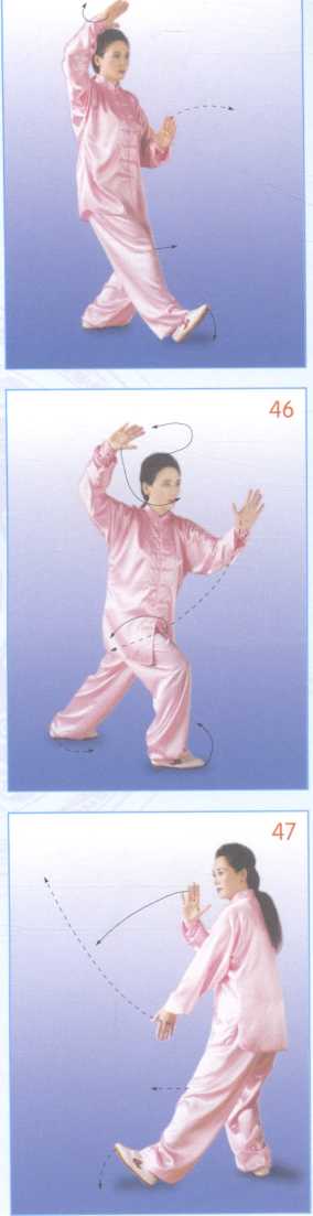 4 .左掌前按 重心前移,弓右 腿,成右弓步(隅步),同时左掌向右前 45度角(东南)按出,掌心向前,虎口向 上,右掌向前向右上采提于头右上 方,掌心向外,指尖斜向上,两掌虎口 遥相对,意在左掌,目视右前方。(图 46)