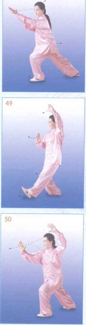 8 .右掌前按 重心前移,弓左腿 成左弓步(隅步),同时,右掌向左前45 度角(西南)按出,掌心向前,虎口向 上,左掌向左向上提于头顶上方,掌 心向外,指尖斜向上,意在右掌,目视 左前方。(图50)