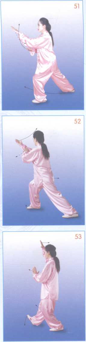 9 .左掌下按重心在左腿,右脚 向前出一步,脚跟着地,成右虚步(隅 步),同时左掌向前下按至左胸上方, 掌心向下,指尖向前,右掌向下落反 采于左肘下方,掌心向上,指尖向左, 意在左掌,目视右前方。(图51)