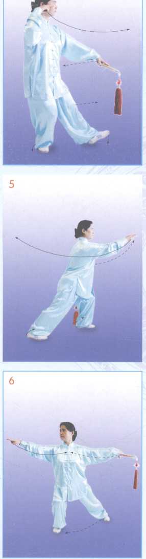 重心在右腿,右脚尖里扣,身微 左转,左脚向左前出一步,脚跟着地, 成左虚步,同时,左手剑柄,向上、向 左弧形甩出落于左腿上方,手心朝 下,指尖斜朝下,右手剑诀,松提右 腕,于右耳外侧。目视左前方(正东)。 意在剑镖。(图4)