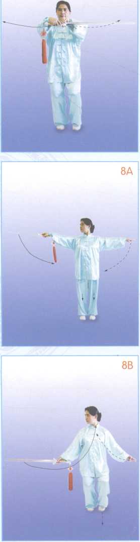 踏实右脚,左脚收于右脚左侧, 成点步,同时两手弧线收于胸前,左 手心朝外,指尖朝右,剑身贴近左小 臂,横于胸前,右手心朝里,指尖朝 左,剑柄交与右手。目视前方,意在右 手剑镇。(图7)
