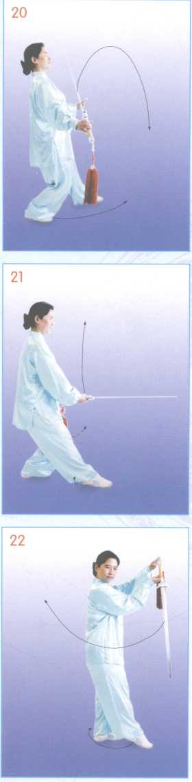 1 .坐身云剑重心后移,坐实右腿,左脚跟内 收,成左虚步,同时右手持剑,小臂内 旋翻转手心向外,使剑前刃往后回, 从面前云过,腕与腹高,剑诀下落外 撑于左前方,腕与胸高,手心向外,指 尖斜向右,左右两臂对称呈弧形,目 视前方,意在剑前刃。(图20)2 .虚步平斩右脚向前出一步,脚前掌着地, 成右虚步,同时,右手持剑,向右、向 下、向左平斩于正前方(东),手心向 上,剑诀弧形,沉落于右腕上方,手心 向下,目随剑动,意在剑前刃。(图21)