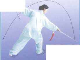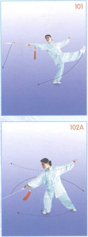 5 .独立提剑重心移于左腿,左脚踏实,提右 膝,大腿成水平,高与胯平,脚尖稍前 展,同时,右手持剑,翻转手心向夕卜, 随身体上长,提于右耳外上方,腕高 于头,剑尖斜向下,剑诀指向前下方, 高与膝平,目视前方,意在剑前部。 (图 100)102B102B102B102B6 .前踹后劈重心不变,右脚向前蹬踹至极 度,高与胯平,同时右手持剑走上弧 线,向右后(正西)下劈,高与肩平,剑 诀向左前上指,高与肩平,指尖向左 前,目随剑动,意在剑前下刃。(图 101)