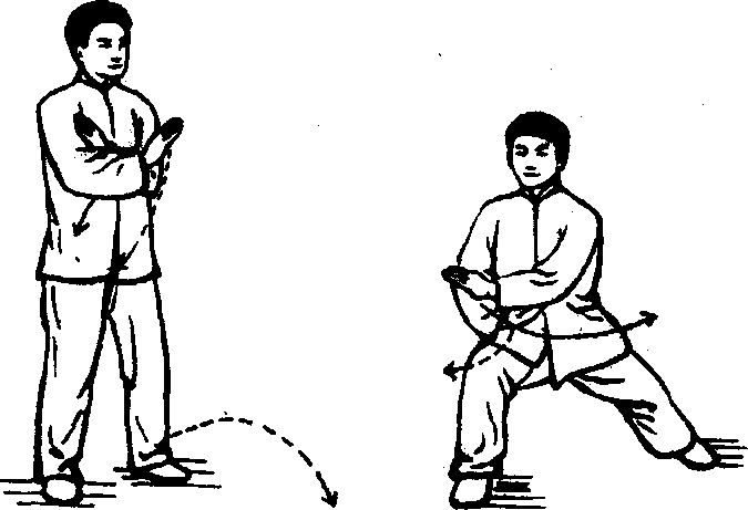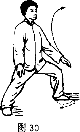 动作二:重心边下沉边左移,左脚向左侧(东北方)横跨一 步成右弓步,同时两臂交叉点循右膝前下截。目视东南方。 (图‘29)