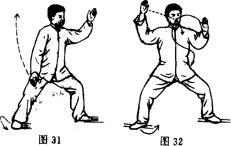 动作时:重心右移,身体左转洞时左掌由左膝外向后、向 上,重心左移,身体右转,同时左掌接上动向前至额前,右掌随 身体右转,由膝外向后、向上、向前至额前上与左掌扣严。(图 31、32) ,