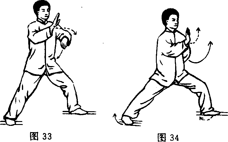 中线下劈,掌心向左,指尖向上。目视南方。(图33.34)
