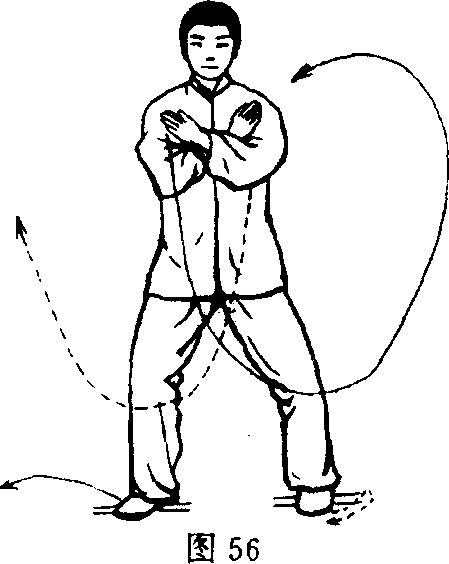 动作一:右拳变掌,两前臂屈,在胸前交叉成十字手,手心 贴于胸。(图56)
