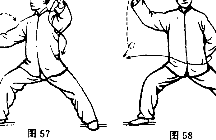 动作四:重心右移,右脚向右上半步,成右弓步;同时左掌 变拳,经身侧落于身后尾闾穴处。右掌变拳,经耳侧上下落于 右眼前外侧,高于眉齐,拳心向左。目视南方。(图57.58)