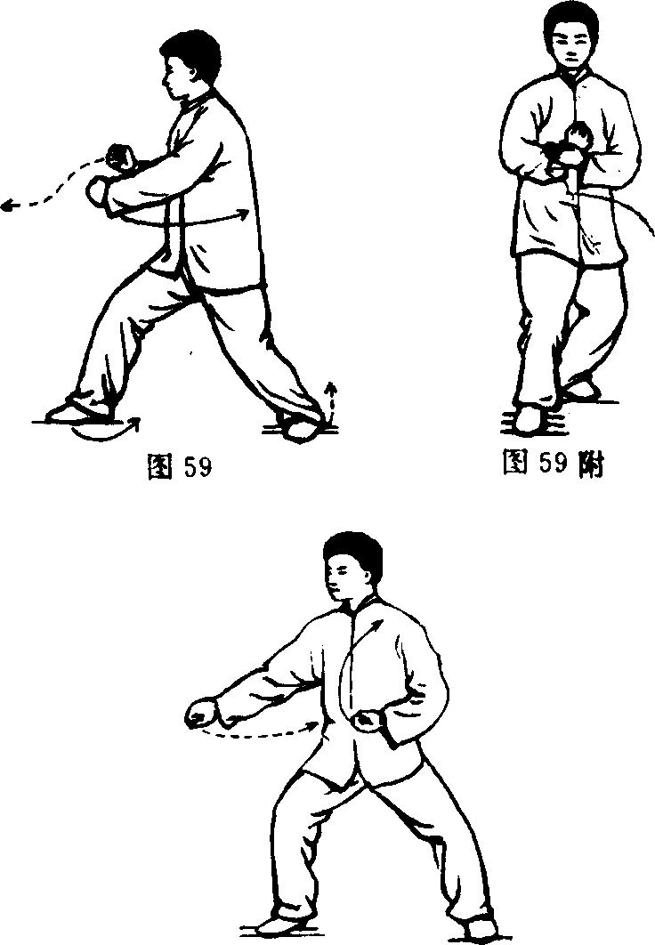 动作三:重心移向右脚,身体以右脚为转点,左转90。,左 脚向右脚跟步,脚尖点地或丁步;同时左掌变拳,臂外旋,拉至 肚脐前,拳心向上,右臂内旋,右拳螺旋向右侧斜下方击出,拳 心向下,高于裆齐。目视西方。(图59、图59附、图60)