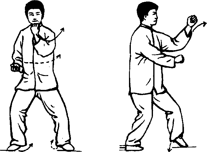 两臂棚圆,两拳随身体转动而发,周身一体,右拳、左膝、 左脚尖上下相照提顶吊裆。