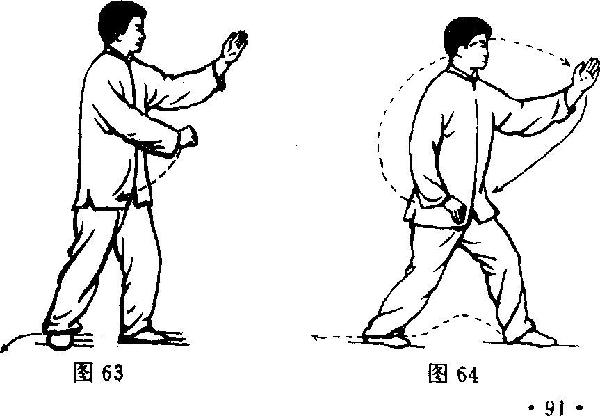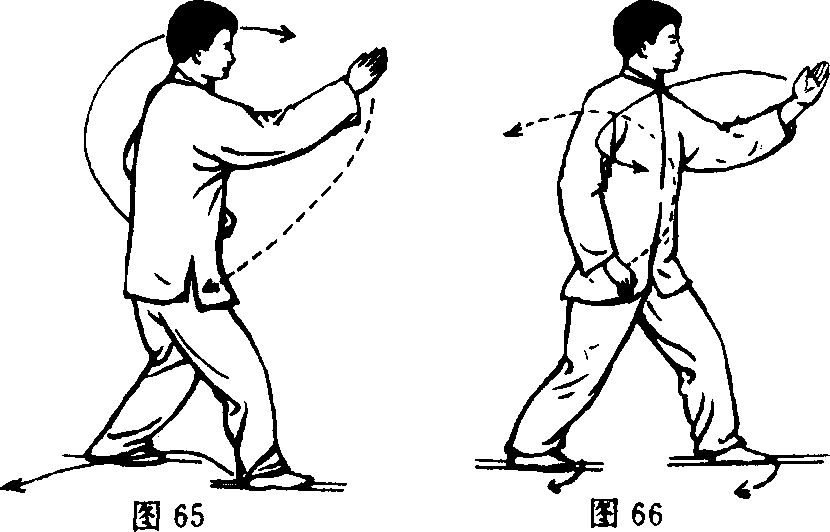 动作三:重心移到右脚,左脚经右脚踝内侧,向左后方,用 脚跟擦地退挂一步成右弓步'同时左掌向下、向后划弧捋挂, 至体侧,手心向下&右掌由体侧、同后、向上、向前划弧,臂外 旋,经头顶至额前中线。掌心向左,指尖向前上,含劈捋劲。如 此左、右往复三次或五次。目视东方。(图63、64、65、66)