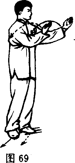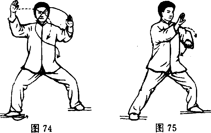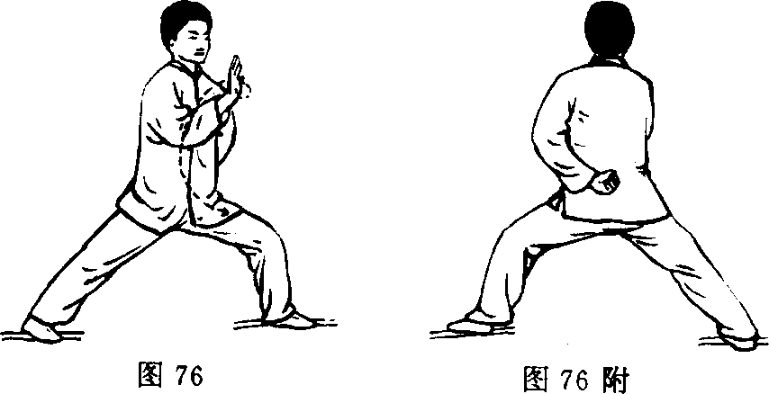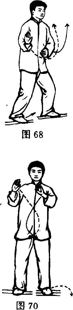 此式[动作方法]、[动作J!点]同第七式白鹤亮翅。目视南方。(图 67、68、69、70)第二十式斜行此式[动作方法]、[动作昊点]同第十一式斜行。目视南 哉T。(图 71、72、73、74、75、76、图 76 附)图71图72图73