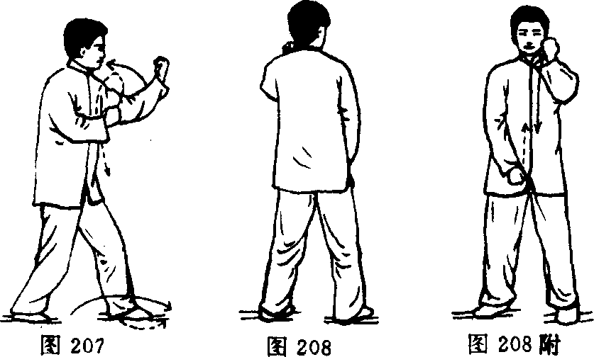 动作厘:重心微左移,右脚上一步,左脚跟上一步,两脚开 立与肩同宽&同时两拳向前撞出,搴心向下,高于肩平。目视北 方。(图 208、图 208 附、图 209.210.图 210 附)