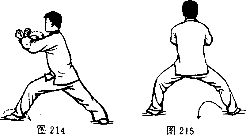 [动作方法]、[动作要点]动作同第六十四式砸七星(右), 唯动作相反。目视西方。(图213)