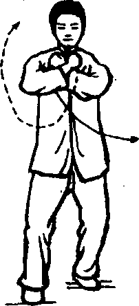 重心微左移,右脚上半步,重心移向右脚,成右弓步;同时 两拳向上、向前翻出,成十字交叉拳,拳心向后,拳面斜向上, 左拳在里,右拳在外。目视南方。(图216、图216附)