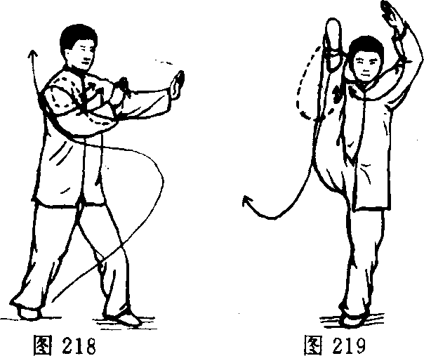 动作二:重心微左移,左脚落地,右脚踢起外摆;两掌向 上,向右顺时针划圆,在右额前侧击拍脚面,向右侧方下落脚。 目视南方。(图218.219)