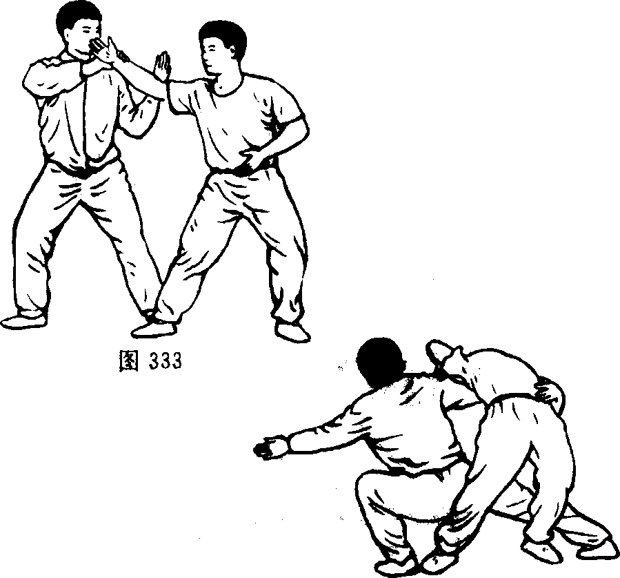 乙双手捋甲右臂,甲用力向后、向下拉手,乙顺甲劲,迅速 下蹲做后扫趣,使甲失去重心而跌倒。(图333.334)
