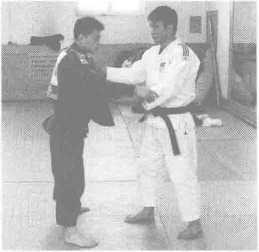 。对方站平架,我站右架。互相左手抓袖,右手抓胸襟。