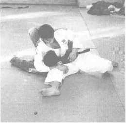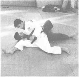 袈裟固是我在仰卧者的体侧,搂抱住对方的肩颈臂,把对方的背固定在垫上。