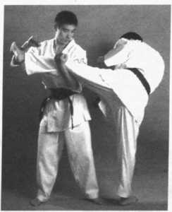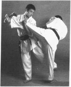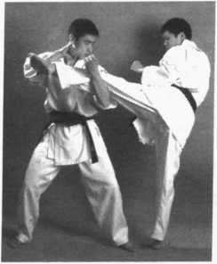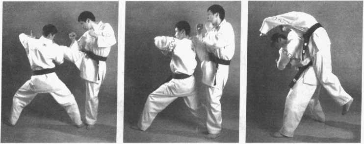 当对手用右正踹踹我胸部,我向左侧闪躲,同时向右转体,右手由右向左搂 对手右膝窝,向右上方提拉,上体前倾左手向前下方推其前胸,迫使对手身体后 仰摔倒。(0 2-135)