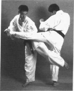 当对手用左正蹬腿攻击我胸部时,我迅速左环绕步躲闪化解,左手抄抱住对 手左膝部位,右手抓握其左小腿下部,垫右步,上体向右后转,左腿从右向左猛 力扫对手右支撑小腿,将其摔倒。(图2-121、图2-122)