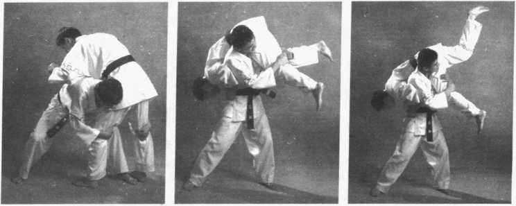 我两手抱住对手左腿,当对手重心下降并按压我背部进行反抗时,迅速用右 手猛力回拉对手小腿,同时左肩下压其腿根部,使对手膝关节被挫而倒地。(图
