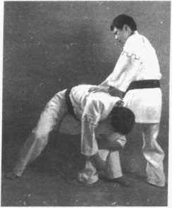 (2)抱单腿过顶摔。左手抱对手左腿根部,右手从外向内搂抱其左大腿,左 肩前顶其股腹部;以肩为支点将对手抱起向后摔。(图2-127)