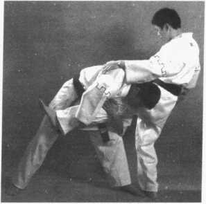 我两手抱住对手双腿,当对手重心下降防守时,我两手屈肘迅猛用力回拉, 同时左肩向前顶对手髓腹部,将其摔倒。(图2-128)