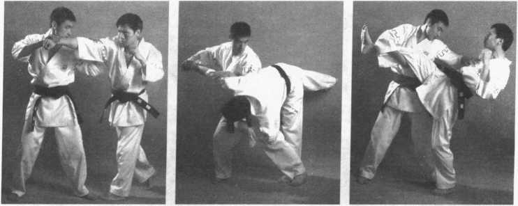 对手用右直拳击打我头部,我用左手由里向外格挡来拳,左脚向前上步,同 时右腿经对手右侧、从后面插入其两腿之间,屈膝向右后方勾对手的右小腿或膝 窝,身体前倾,并向左转,将对手摔倒。(图2-136、图2-137)